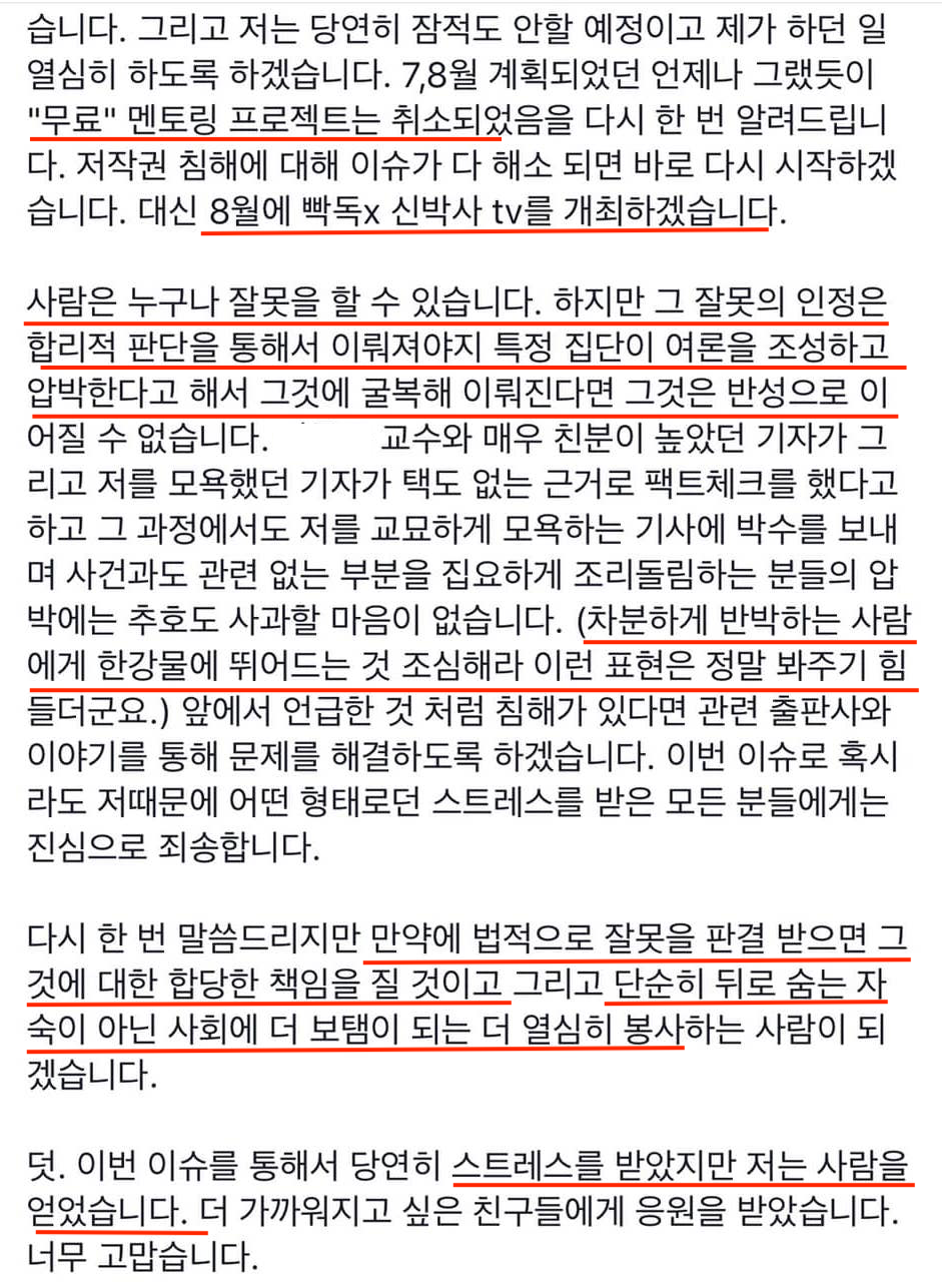=> 번역) 내가 입을 열 때마다 아무말이 나오니 더 말할수록 더 피곤해질거 같아서 이번이 마지막 글이다. 금방 또다른 마지막 글을 쓰도록 하겠다. 그리고 나는 잘못한거 없는데 법원이 시키면 그때는 어쩔 수가 없으니까 그때가서 벌금을 내든 어쩌든 딱 판결 나오는만큼만 물어내겠다. 그러면 되는거다. 교수처럼 자발적으로 사과니 기부니 자숙이니 하고 그러는거 아니다.