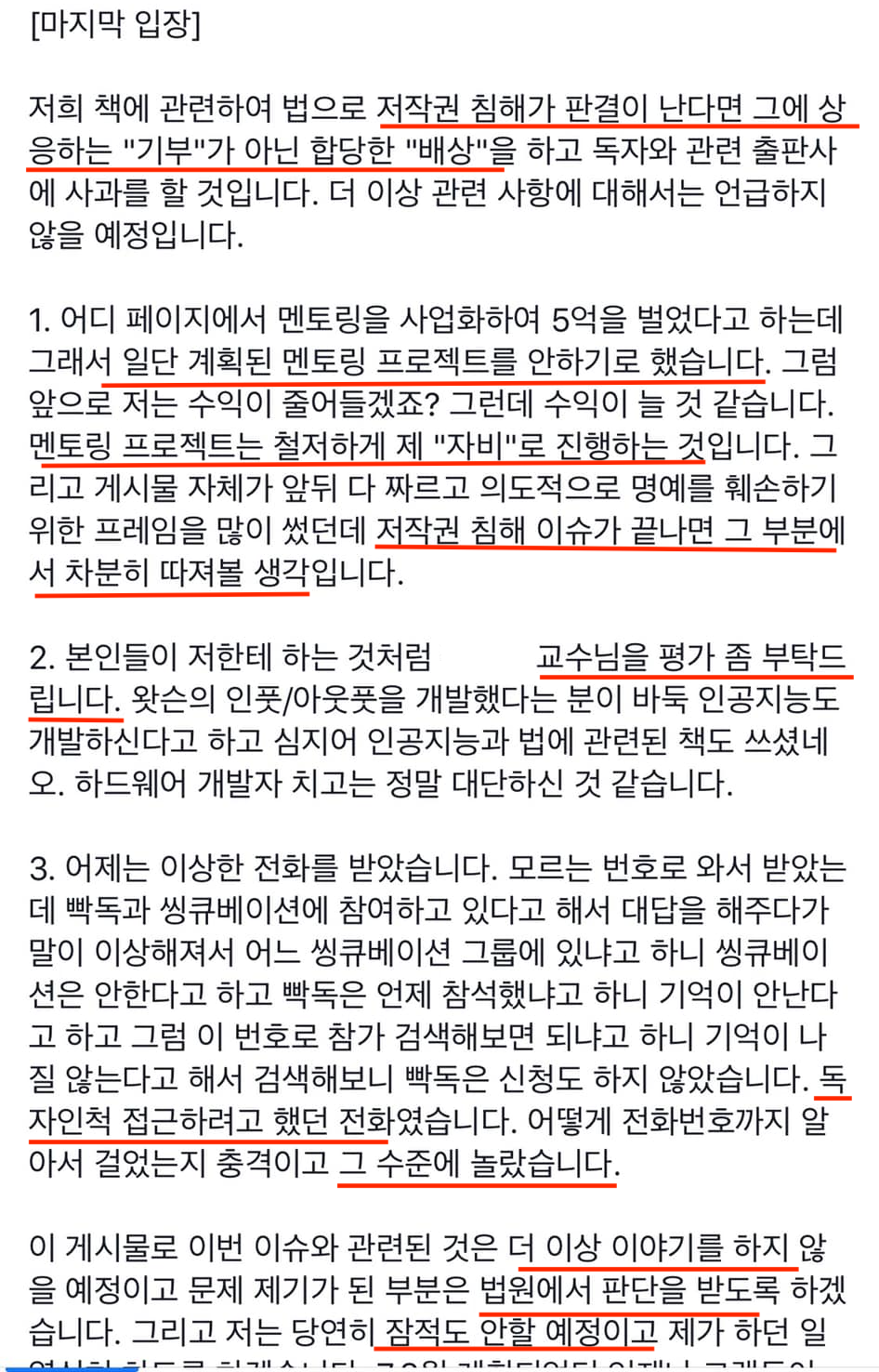 => 번역) 내가 입을 열 때마다 아무말이 나오니 더 말할수록 더 피곤해질거 같아서 이번이 마지막 글이다. 금방 또다른 마지막 글을 쓰도록 하겠다. 그리고 나는 잘못한거 없는데 법원이 시키면 그때는 어쩔 수가 없으니까 그때가서 벌금을 내든 어쩌든 딱 판결 나오는만큼만 물어내겠다. 그러면 되는거다. 교수처럼 자발적으로 사과니 기부니 자숙이니 하고 그러는거 아니다.