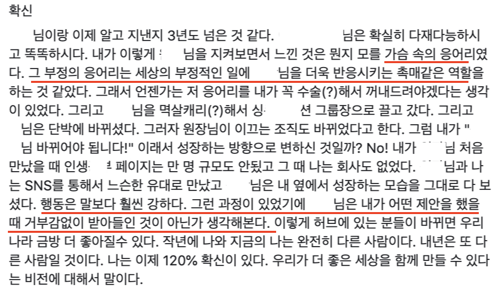 현재는 저작권 침해 사실이 법적으로 문제가 되고 있지만, 이것은 그의 사상이 겉으로 발현된 여러 행태 중 하나가 어쩌다 법에 걸린 것 뿐입니다. 수면 아래에서는 광인의 이데올로기 (사상)가 아직 넓은 범위로 작동하고 있습니다. 대부분은 아직 법에 걸리지 않은 형태로 말입니다. 아래는 7월 19일자 광인의 한말씀입니다. 누군가를 만나서 확신을 가졌다고 합니다.