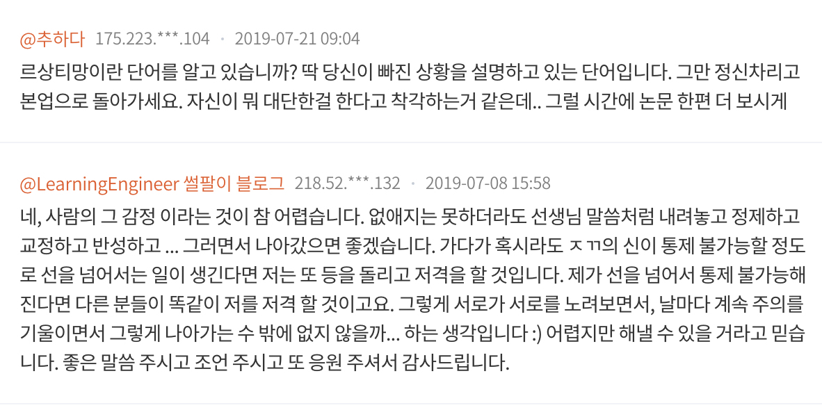 둘째로, '자신이 뭐 대단한 걸 한다고 생각하는듯' 입니다. 이것은 매우 맞는 지적입니다. 저는 직업이 대학원생이고, 저와 아무 상관도 없는 일에 괜히 뛰어들어서 행동대장 노릇을 하고 있습니다. 댓글의 표현은 비아냥이지만 내용만 뜯어서 보면 틀린 것이 없습니다. 그런데 글이란 내용만 있는게 아닙니다. 표현도 있습니다. 댓글 기능이란 서로 소통을 하자고 달아놓은 것입니다. 남의 온라인 공간에 들어와서 댓글 기능에 익명의 의견을 어떤 내용이든 제시하는 것은 자유이고 저도 그러기를 원하므로 댓글을 지우지 않습니다. 악플이든 무엇이든 간에 저의 공간에 남긴 것은 박제를 합니다. 저에게 주신 것이니까요. 그런데 남의 집에 들어와서 대뜸 던지는 말이 추하다니요. 표현을 보아하니 대화를 하자는 의도가 아닌 줄은 알겠습니다. 주신 내용은 저도 인정합니다만, 내용이 어떻든 익명의 댓글창에 비아냥의 표현을 사용하시니 그것은 남의 집에 마스크를 쓰고 들어와 너는 틀렸다 고치라는 선민의식을 던지고 가는 것입니다. 누가 르상티망일까요?