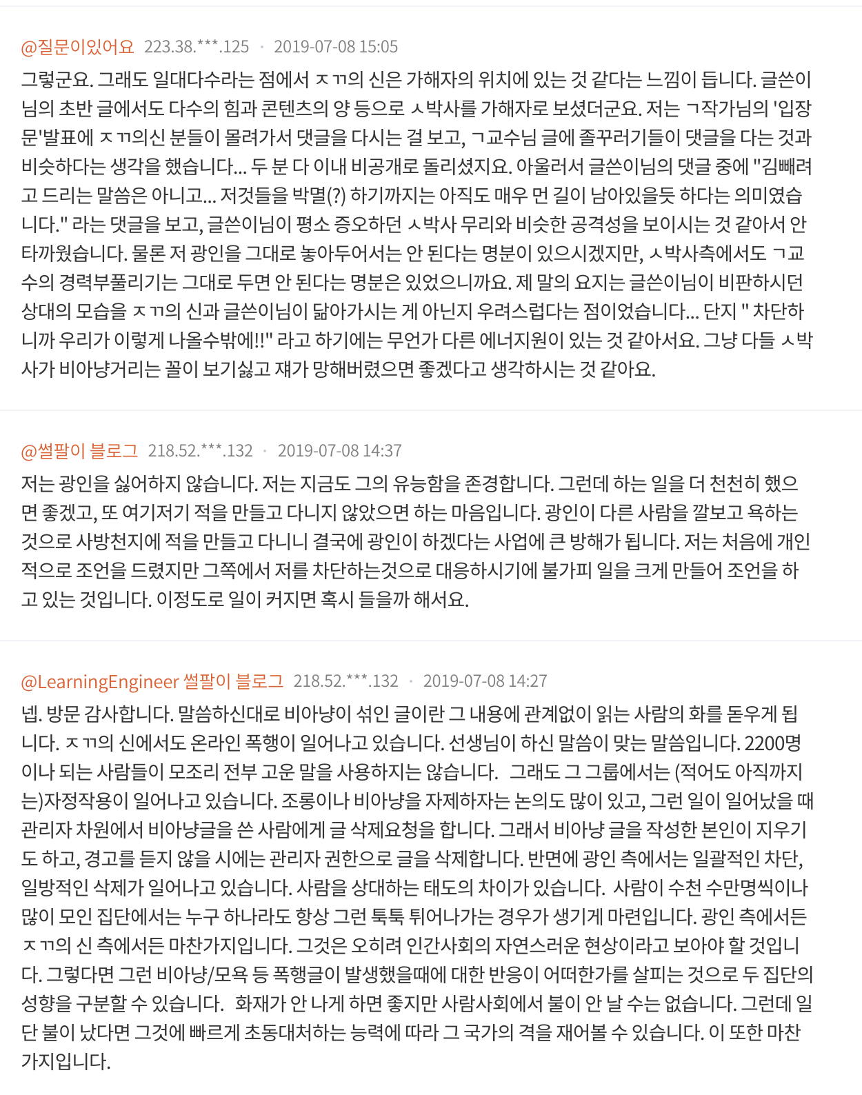 셋째로, 저는 이 사건에 대해서 아무런 관련도 자격도 없고 행동대장 노릇을 할 이유도 없습니다. 처음에는 혼자 하루평균 4.3편을 글을 쏟아내는 식이었지만 지금은 페이스북 그룹 내에서 다른 많은 분들이 더 좋은 컨텐츠를 만드는걸 보고, 저는 이제 옆에서 댓글이나 달면서 글은 예전보다 자주 올리지 않고 있습니다. 어쨌든 글만 빼곡히 적힌 블로그에 일평균 수백~수천명의 분들이 들러주시니 '와 내가 뭔가를 이끌고 있어' 그런 기분이 들기도 합니다. 그러나 이것은 제가 이전에 해 본 적도 없고, 저에게는 새로운 경험이며, 제가 저를 컨트롤 하면서 뭔가를 배울 수 있는 인생의 좋은 기회이자 재료라고 생각합니다. 어디까지가 넘지 말아야 할 선인지를 저는 안 해봤으니 모르고, 그래서 선을 넘는 행동이나 발언을 할 때도 많이 있다고 생각합니다. 그러면 저는 다른 분들이 저에게 주시는 이런저런 피드백을 받고, 아 이만큼은 선을 넘은 것이구나 하지요. 저는 그런 식으로 뭔가를 직접 해보면서 배웁니다. 저는 평생 논문만 쳐다보는 공부벌레로 살다 가고 싶지 않습니다. 세상에서 한국에서 무슨 일이 일어나는지 관심도 많고요. 그것은 제 성격이고 제가 원해서 하는 것입니다. 제가 원해서 수영을 배우고 피아노를 배우듯, 이것도 일종의 개인 생활입니다. 악플에 대처하는 법도 해 봐야 배우는 것입니다. 일이 벌어진지 한 달이 조금 넘게 되었습니다. 뭘 배우든 제대로 익히려면 3개월은 잡아야지요. 이런 일을 계기로 예방주사를 맞아 놔야 나중에 내 가정이 피해를 입어도 내가 지킬 것 아닙니까. 저는 그렇게 생각합니다. 이 사건이 잠잠해지면 저는 쥐죽은듯이 제 원래 있던 자리로 돌아갈 것입니다. 내 개인 블로그 관리는 내가 알아서 할 테니 나에게 간섭을 하고 싶거든 비아냥을 버리고 사람의 대화체를 가지고 오시기 바랍니다. 그러면 당신의 조언을 내가 귀 기울여 듣겠습니다.