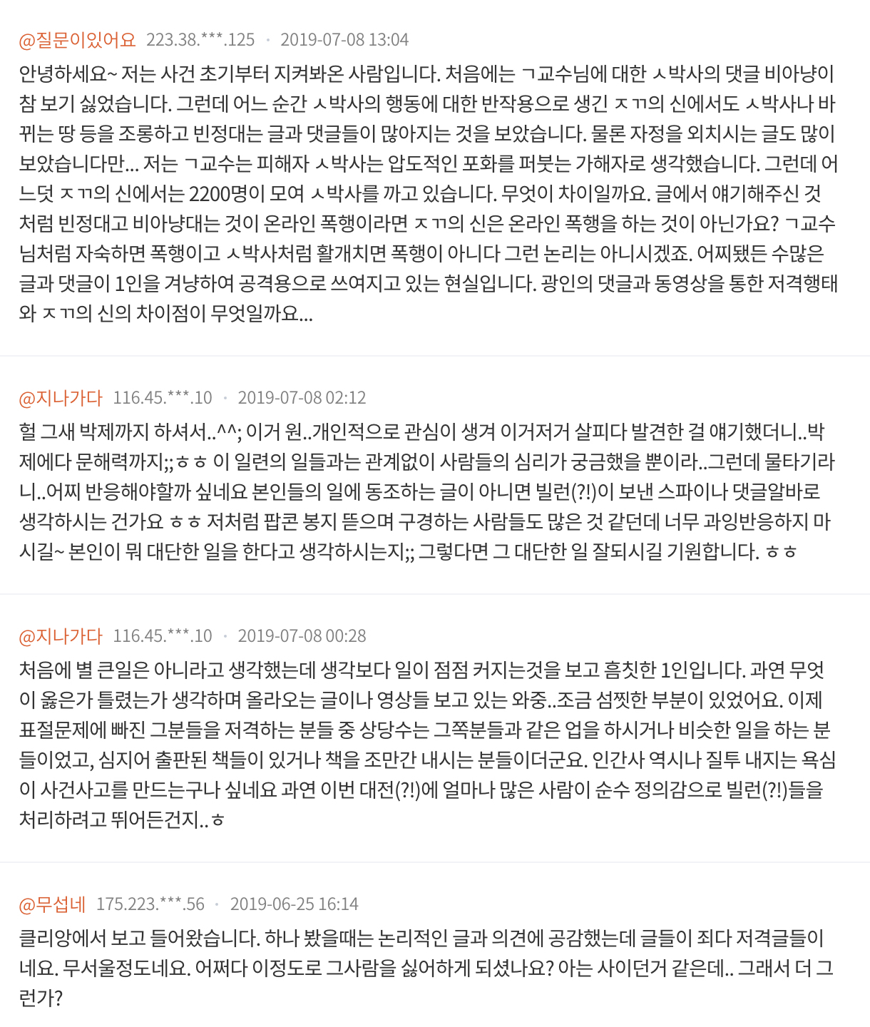 셋째로, 저는 이 사건에 대해서 아무런 관련도 자격도 없고 행동대장 노릇을 할 이유도 없습니다. 처음에는 혼자 하루평균 4.3편을 글을 쏟아내는 식이었지만 지금은 페이스북 그룹 내에서 다른 많은 분들이 더 좋은 컨텐츠를 만드는걸 보고, 저는 이제 옆에서 댓글이나 달면서 글은 예전보다 자주 올리지 않고 있습니다. 어쨌든 글만 빼곡히 적힌 블로그에 일평균 수백~수천명의 분들이 들러주시니 '와 내가 뭔가를 이끌고 있어' 그런 기분이 들기도 합니다. 그러나 이것은 제가 이전에 해 본 적도 없고, 저에게는 새로운 경험이며, 제가 저를 컨트롤 하면서 뭔가를 배울 수 있는 인생의 좋은 기회이자 재료라고 생각합니다. 어디까지가 넘지 말아야 할 선인지를 저는 안 해봤으니 모르고, 그래서 선을 넘는 행동이나 발언을 할 때도 많이 있다고 생각합니다. 그러면 저는 다른 분들이 저에게 주시는 이런저런 피드백을 받고, 아 이만큼은 선을 넘은 것이구나 하지요. 저는 그런 식으로 뭔가를 직접 해보면서 배웁니다. 저는 평생 논문만 쳐다보는 공부벌레로 살다 가고 싶지 않습니다. 세상에서 한국에서 무슨 일이 일어나는지 관심도 많고요. 그것은 제 성격이고 제가 원해서 하는 것입니다. 제가 원해서 수영을 배우고 피아노를 배우듯, 이것도 일종의 개인 생활입니다. 악플에 대처하는 법도 해 봐야 배우는 것입니다. 일이 벌어진지 한 달이 조금 넘게 되었습니다. 뭘 배우든 제대로 익히려면 3개월은 잡아야지요. 이런 일을 계기로 예방주사를 맞아 놔야 나중에 내 가정이 피해를 입어도 내가 지킬 것 아닙니까. 저는 그렇게 생각합니다. 이 사건이 잠잠해지면 저는 쥐죽은듯이 제 원래 있던 자리로 돌아갈 것입니다. 내 개인 블로그 관리는 내가 알아서 할 테니 나에게 간섭을 하고 싶거든 비아냥을 버리고 사람의 대화체를 가지고 오시기 바랍니다. 그러면 당신의 조언을 내가 귀 기울여 듣겠습니다.