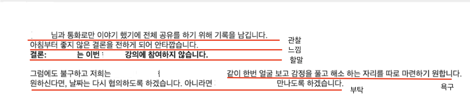 저는 신입사원이었지만 계약이 시작되기 전의 일을 종종 맡기도 했습니다. 한 번은 여러 회사가 동시에 참여하는 강의 컨소시엄에 들어갔는데 소통에 문제가 발생하여 서로의 감정이 상하게 되었습니다. 일이 파국으로 치닫던 중 제가 감당할 수 없는 것임을 알고 회사 대표님이 중재를 해 주신 적이 있습니다. 그때 저희 대표님이 상대측에 보낸 메일을 세부 내용을 지우고 공개해봅니다.