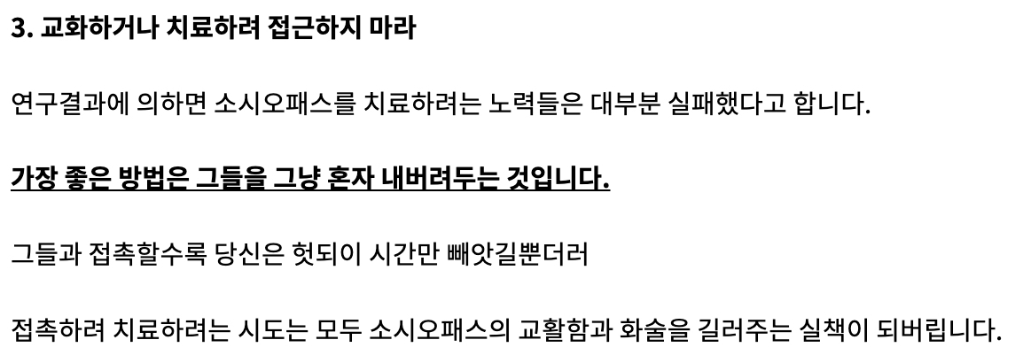 접촉하려 치료하려는 시도는 모두 소시오패스의 교활함과 화술을 길러주는 실책이 되버립니다.