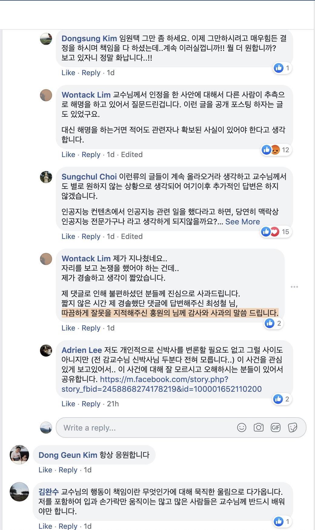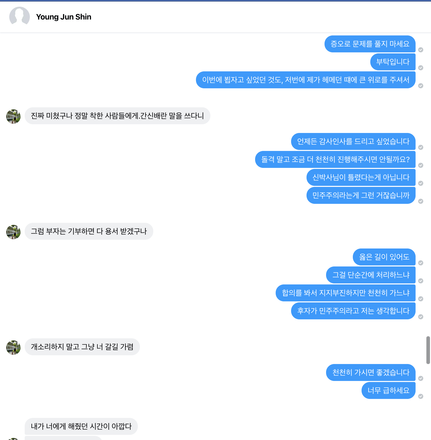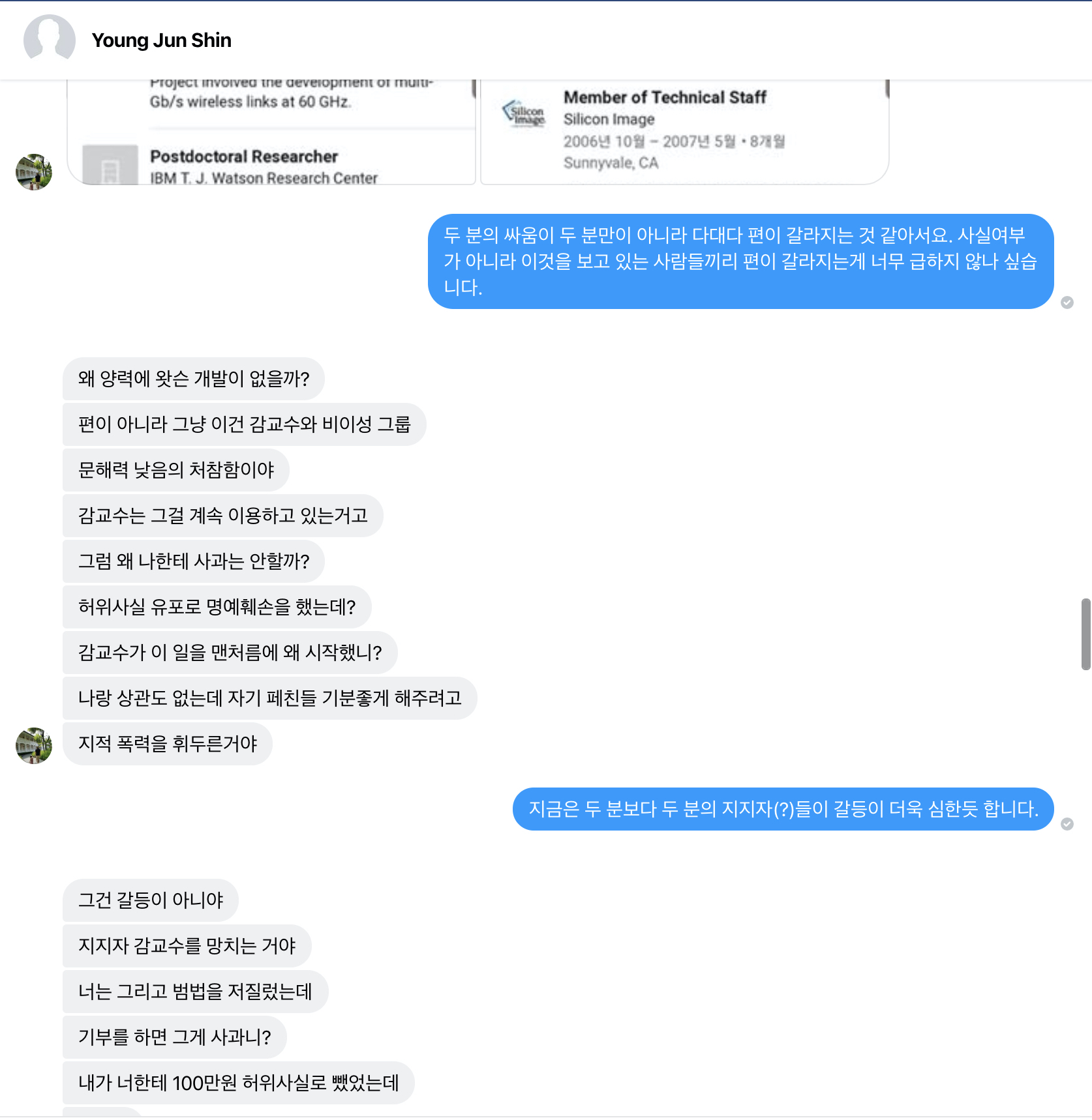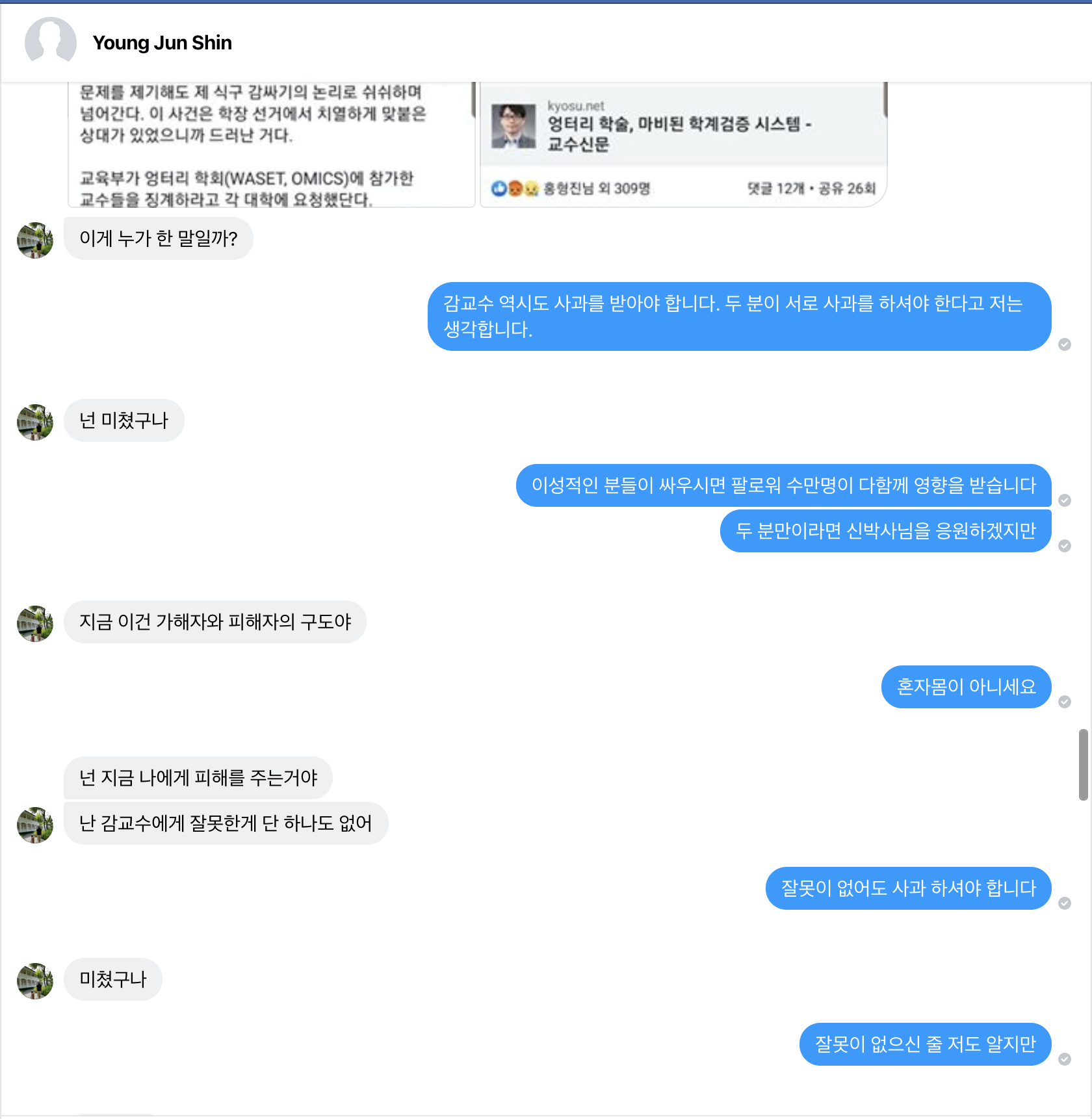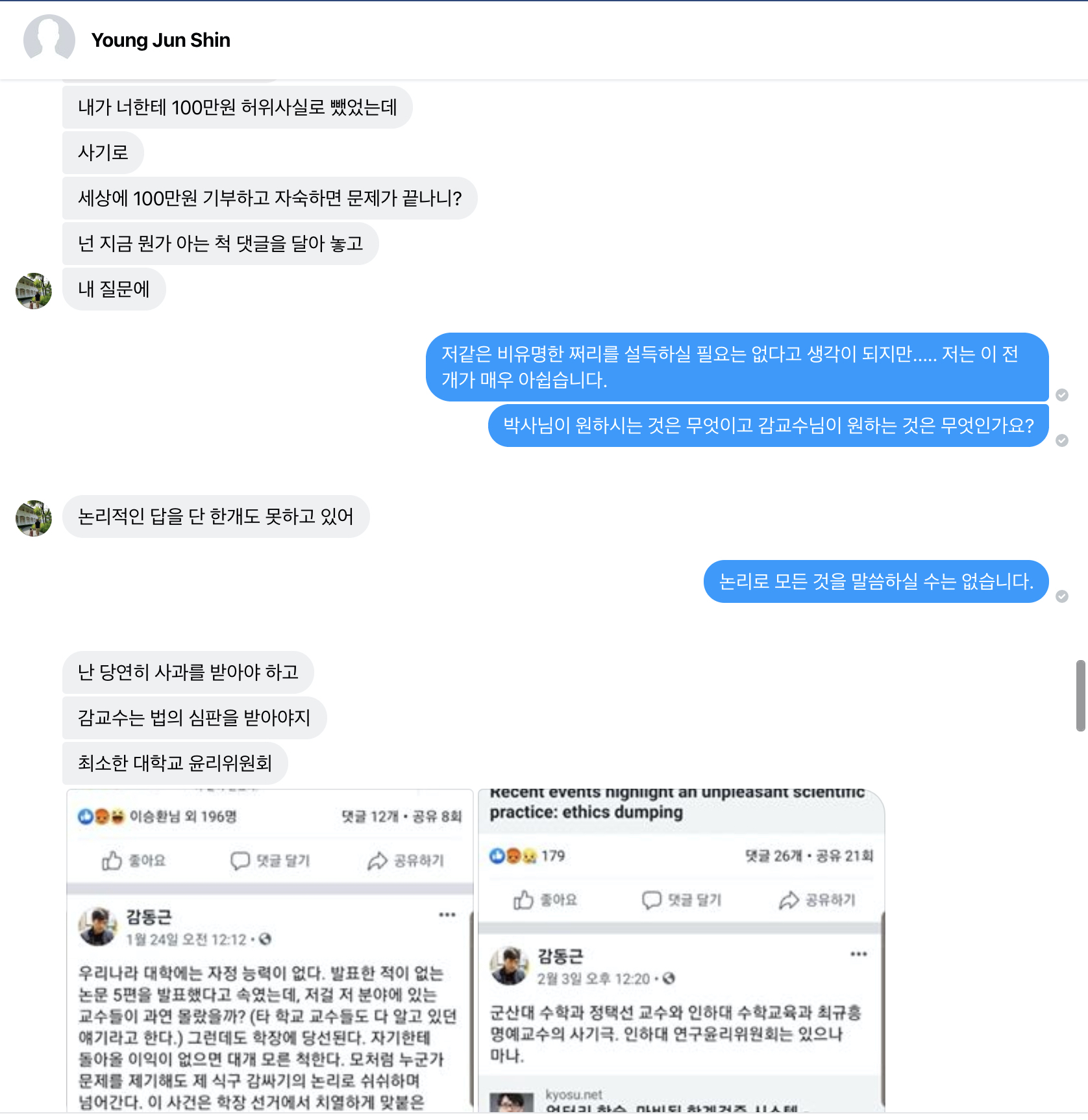 때는 2019년 6월 10일, 신영준씨가 K교수님을 음해하여 벌어진 사건을 보면서 여러 사람들이 매우 화가 나 있는 상태였습니다. K교수님이 탄자니아에 돈을 기부한 직후에, 그 영수증을 천원 단위까지 적어서 페이스북 포스팅으로 올렸었습니다. 아래 사진은 그 포스팅에 달린 댓글 중 일부입니다. 어떤 졸꾸러기 분 한명이 신영준씨의 선동 동영상을 봤는지, 아무튼 K교수님의 담벼락에 와서 핵논리의 어깃장을 늘어놓으셨고, 저는 보다가 '사람 사회의 자리를 봐 가면서 옳고 그름을 밀어붙이시라'고 한말씀 드린 것이 전부였는데, (아래 신영준씨와의 대화 직후 저는 제가 올린 대댓글을 지웠습니다), 그 댓글을 신영준씨가 읽어본 것이죠.