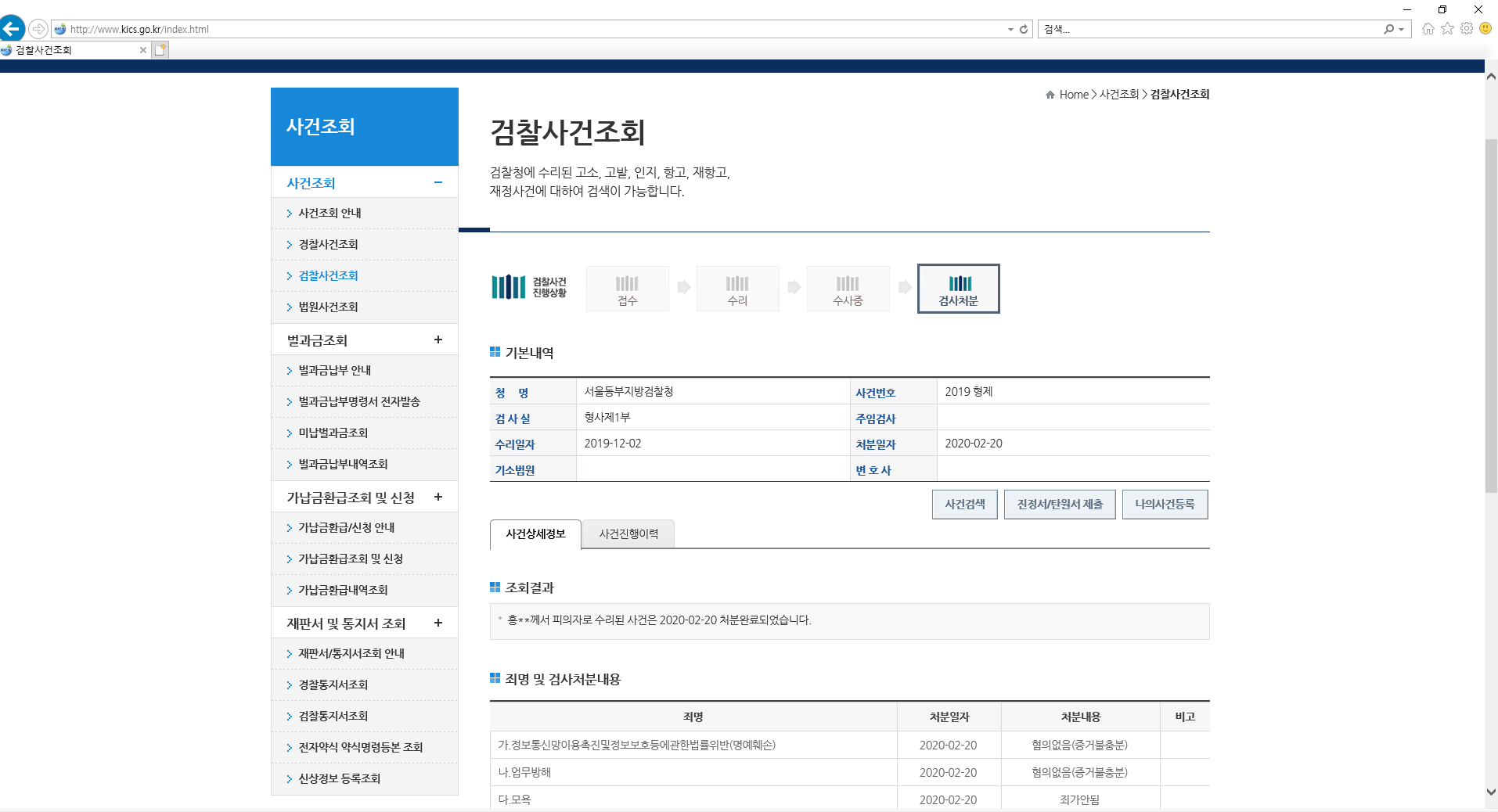 2020년 2월 20일 혐의없음/죄가안됨 으로 검사처분을 받았습니다.