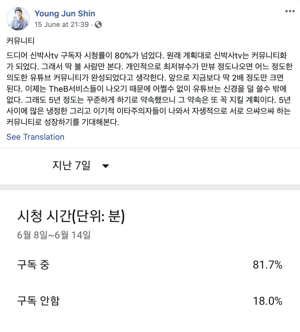 이틀전 포스팅에서는 6월 8일 ~ 6월 14일 일주일간 신박사TV 총 재생시간 중에, 구독자가 시청하는데 보낸 시간이 81.7%라고 하네요.