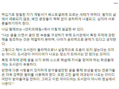 교수는 [친구공개]였던 원래 글에 문제의 소지가 있다는 자신의 '실수'를 인지하여 메타인지를 발휘해서 빠르게 내린 후에 본인이 [전체공개]로 아래 글을 다시 올렸습니다. 이후 글에서는 누구를 일컫는 것인지 실명을 거론하지 않았습니다. 원래 친구공개였던 글 내용을 일반화해서 어떤 사회현상의 관점으로 작성해 올렸습니다. 실명으로 누구를 비판한다는 것이 어떤 책임을 의미하는지를 본인이 인지한다는 뜻입니다. 교수는 사회현상에 대해 논할만한 수준의 문해력 훈련을 한 사람이니까요. 또 그런 일 하라고 월급받고 하는 직업이고. 교수의 분야는 뭐 공대이지만, 어떤 지식을 얻고 책이 어쩌고 이야기를 하는데 공대 인문대 가려서 말할 것은 또 아니죠.