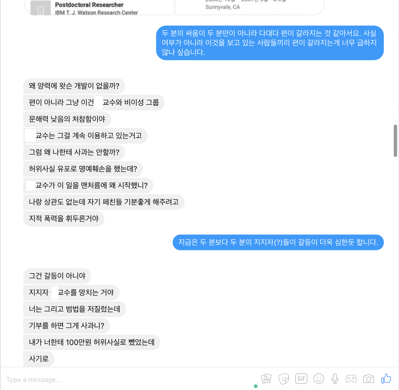 저쪽에서 계속 물고 늘어지는 트집이 'OOO교수는 사과를 안한다' 거든요. 저 봐라 카르텔 맞지. 이거에요. 여러분이 OOO교수 입장이라고 생각해보세요. 페북에 친구공개로 뭐라 말을 하다가 앗차 싶어서 한시간만..